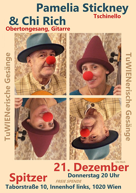 Chi Rich reiste 1995 nach Tuwa in Sibirien, um dort die Technik des zentralasiatischen Kehlgesangs zu erlernen. Inzwischen ist es ihm möglich, mit eben dieser Gesangstechnik Klassiker wie Schubert, Mozart, Strauss sowie Eigenkompositionen zu interpretieren. Dazu begleitet er sich selbst auf der Gitarre. Pamelia Stickney kommt aus Kalifornien, lebt in Wien und ist aufmerksamen HörerInnen bereits als Theremin-Virtuosin bekannt. In diesem Duo spielt sie allerdings Tschinello, ein mit Schlagwerk ausgestattetes Violoncello, und kann so ihre Liebe zu akustischer Musik, die sie mit Chi Rich teilt, ausleben.